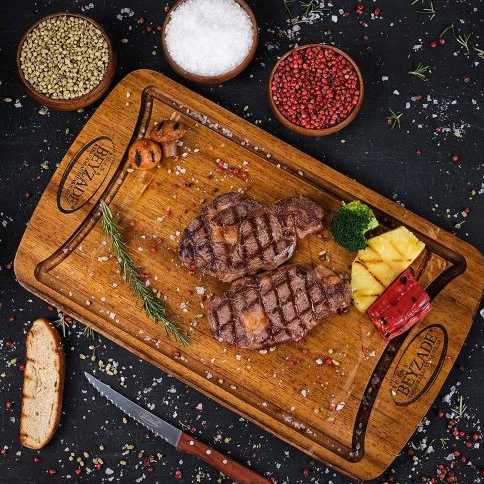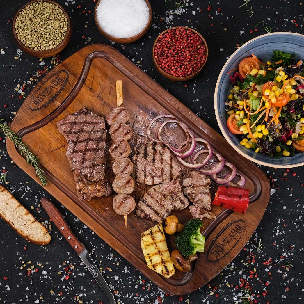 New York, şaşlık, yağlı kara' dan oluşan zengin steak tabağımız, mini pizza, mevsim salata, bostane salata, çiğ soğan salata, pişmiş soğan, tablacı salata, pişmiş domates ve biber eşliğinde servis edilir.