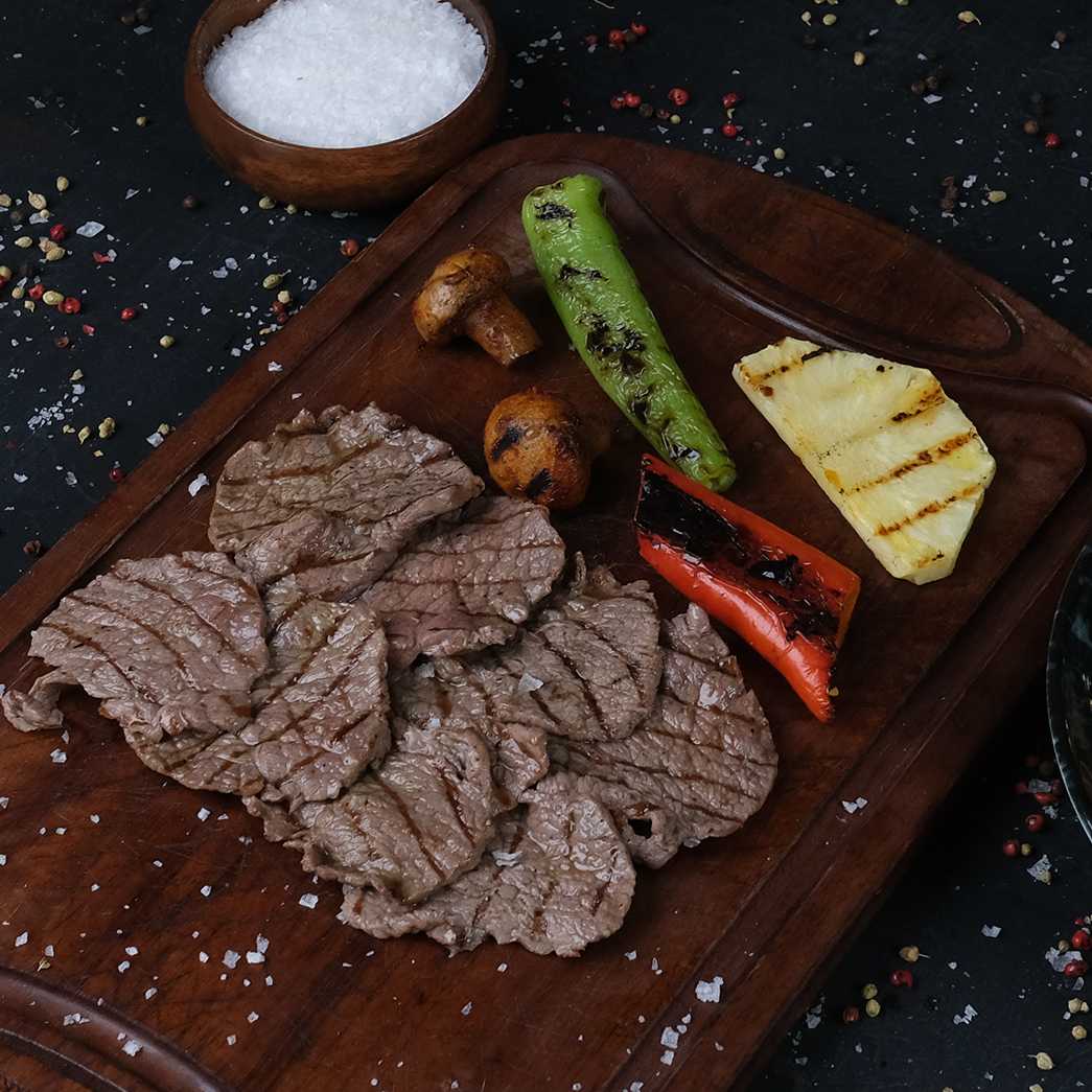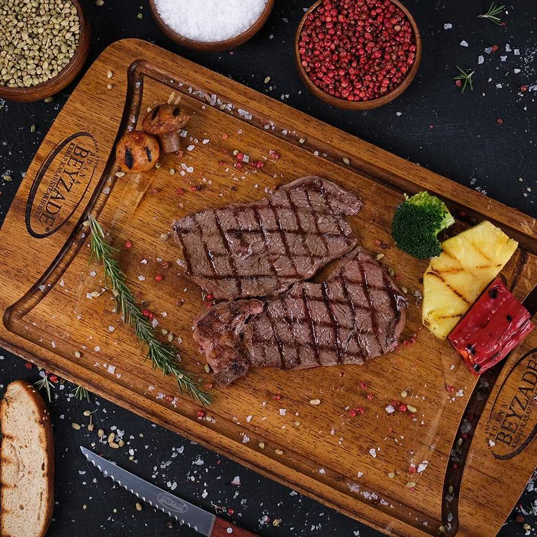 Dananın sırt kısmında bulunan ve kontrfilesinden elde edilen 10/15 gün Dry Aged dolabında kuru dinlendirilmiş ve meşe kömürde pişirilmiş, newyork steak (250 gr) mini pizza, mevsim salata, bostane salata, pişmiş soğan. Ananas, mantar, brokoli (brüksel lahanası), kapya biber garnitürler eşliğinde servis edilir.