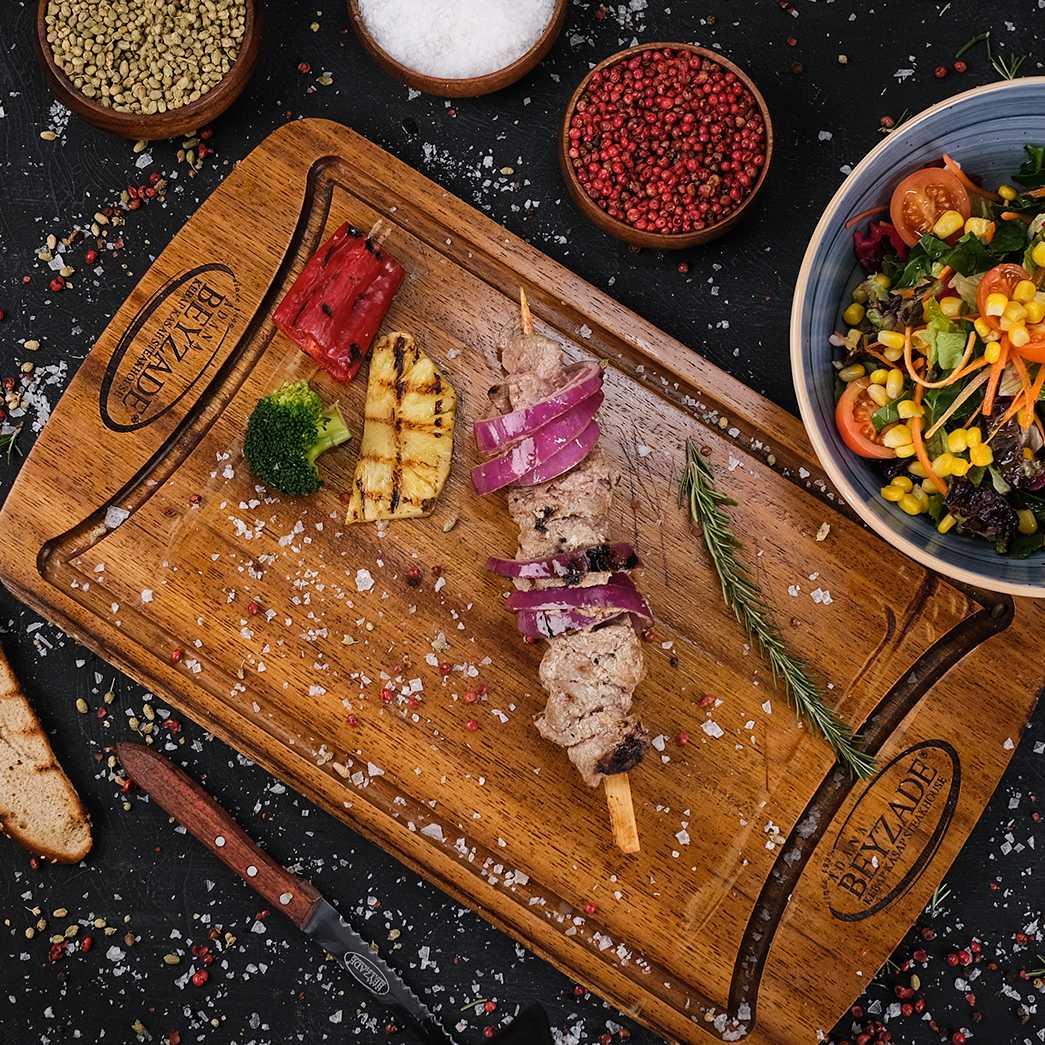Dananın en değerli bölümünden çıkarılan dana bonfilenin ve doğranmış soğanların kremalı özel sosta bekletilerek dinlendirdikten sonra meşe kömürü ateşinde pişirilen dana şaşlık, mini pizza, mevsim salata, bostane salata, çiğ soğan salata, pişmiş soğan, tablacı salata, pişmiş domates ve biber eşliğinde servis edilir.