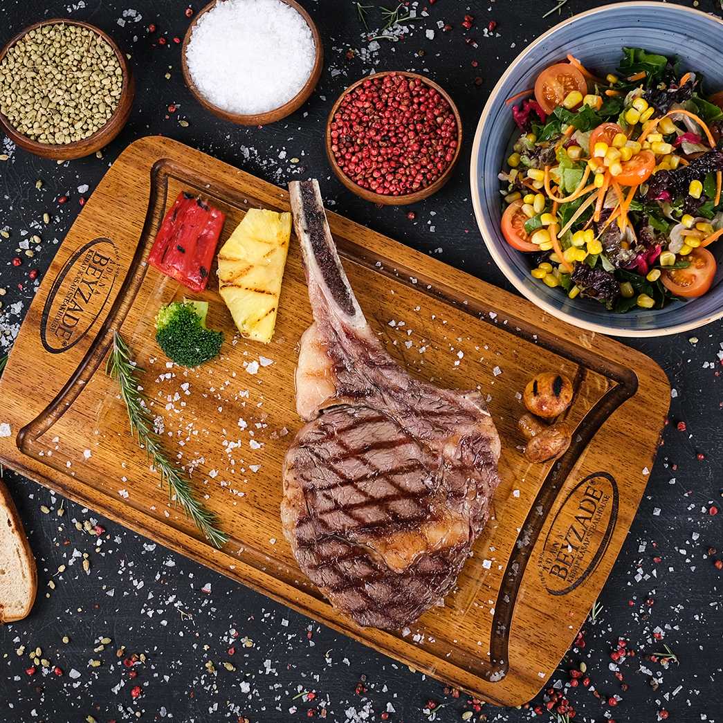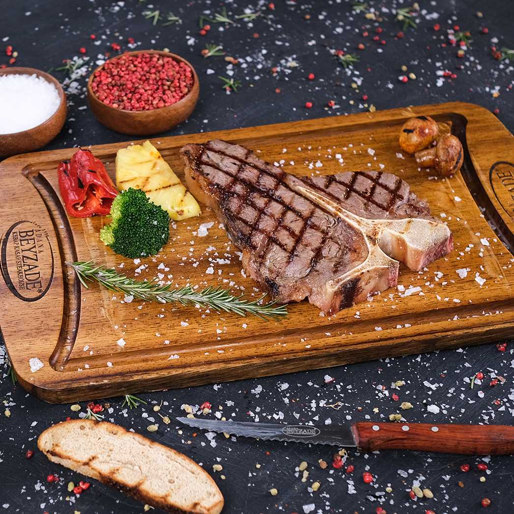Dananın sırt kısmında bulunan ve bir kısmı bonfile bir kısmı kontrfile olan değerli etin 3/4 hafta Dry Aged dolabında kuru dinlendirilmiş ve meşe kömürde pişirilmiş, (350-400 gr), mini pizza, mevsim salata, bostane salata, pişmiş soğan. ananas, mantar, brokoli (brüksel lahanası), kapya biber garnitürler eşliğinde servis edilir.