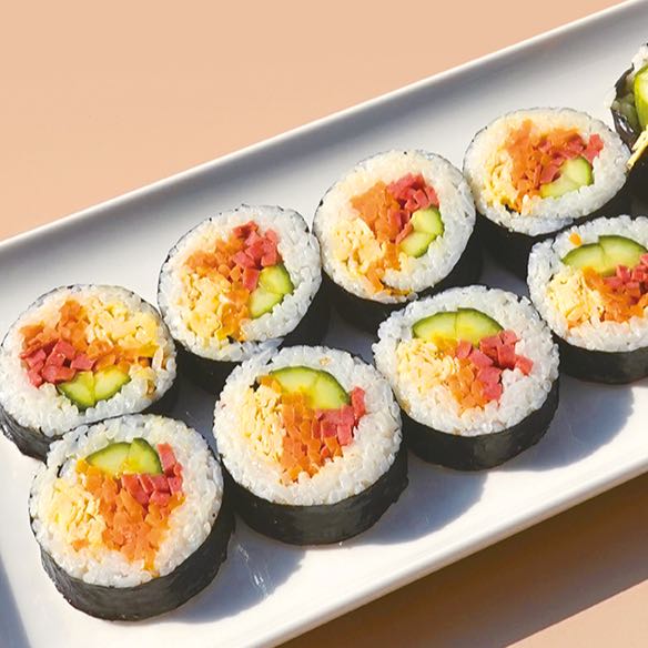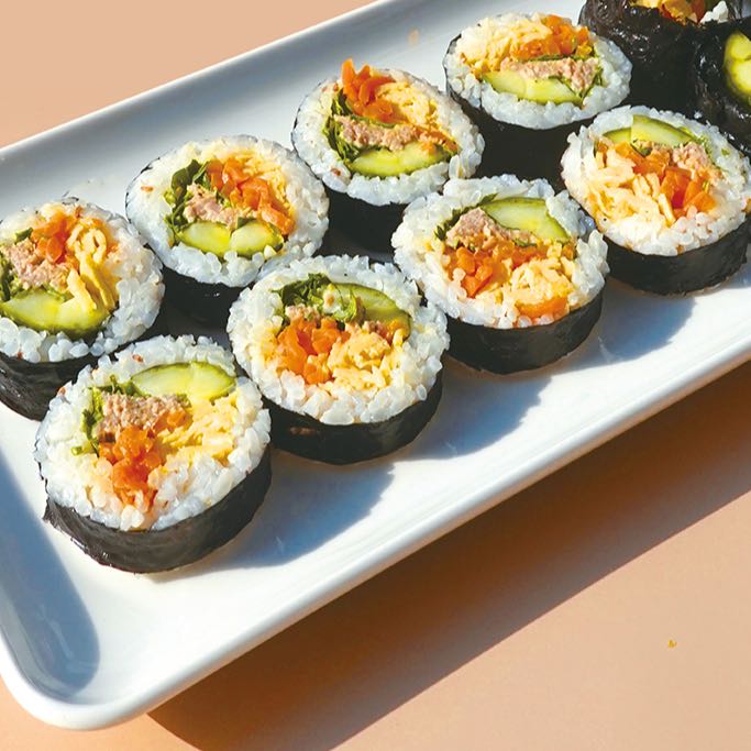 Gimchi Gimbap (Yosun, pirinç, salam, havuç, salatalık, yumurta,Lahana, soğan, yeşil soğan, havuç, toz biber)