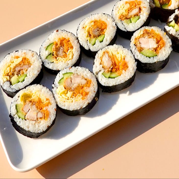Tavuklu Gimbap (Yosun, pirinç, tavuk, havuç, salatalık, yumurta, hardal sos)