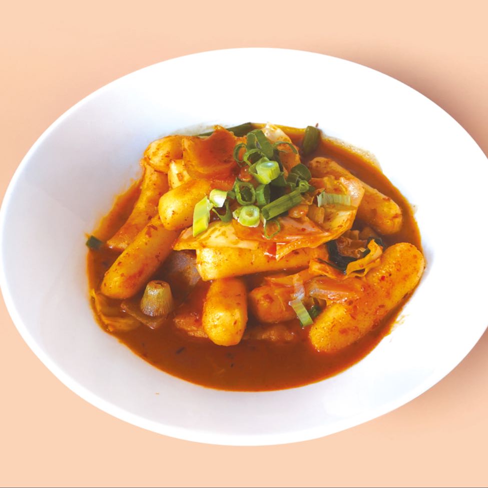 Kaşar peynirli Tteokbokki (Pirinç keki, özel acı sos, lahana, yeşil soğan,soğan)