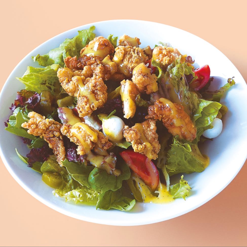 Kızartmış Tavuklu salata (Akdeniz marulu, roka, domates, peynir, hardalsosu, tavuk)