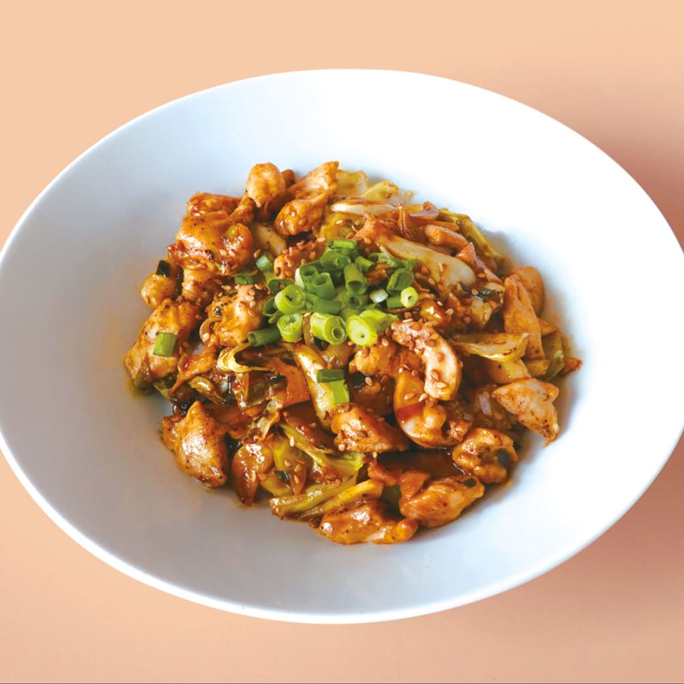 Acı soslu Kavrulmuş tavuklu pilav(Tavuk, pirinç, özel acı sos, lahana, yeşil soğan,soğan, sarımsak)