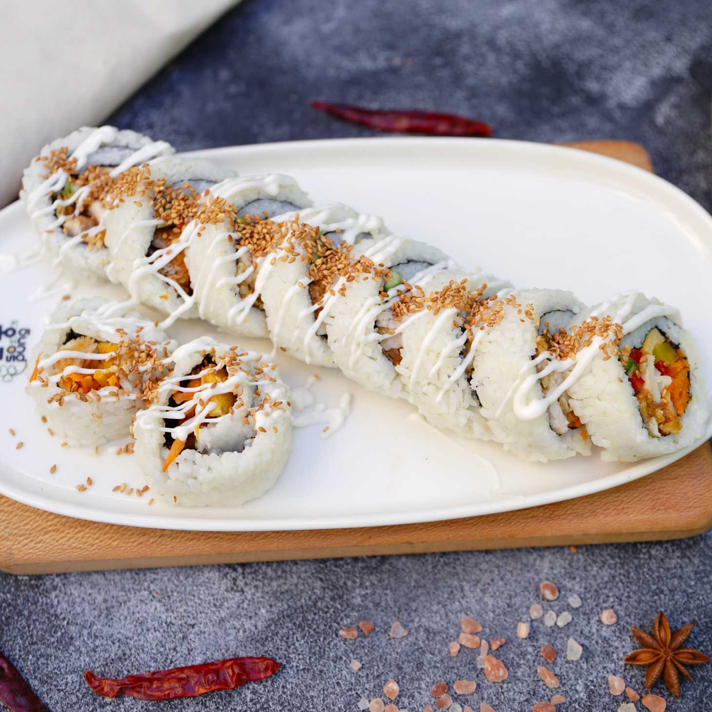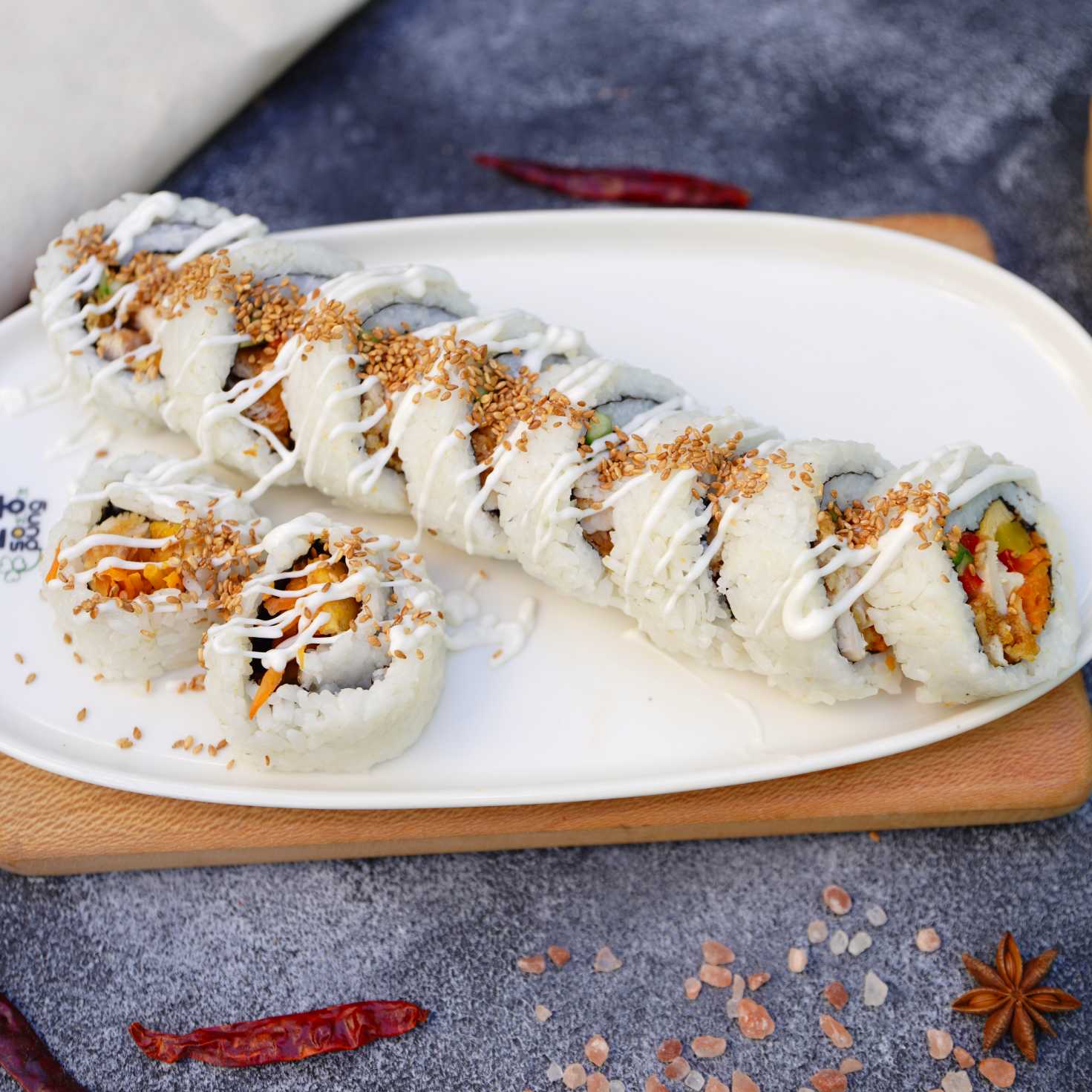Tavuk Eti ve Teriyaki Soslu Gimbab (Çıtır Tavuk, Salatalık, Yumurta, Danmuji, Biber, Havuç, Pirinç ve Yosun)