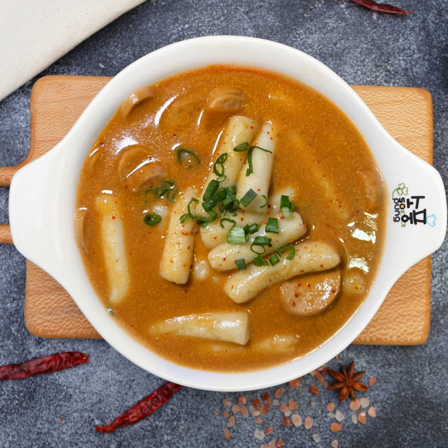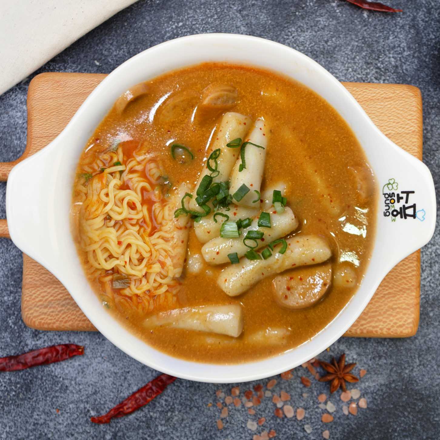Kore Özel Kremalı Salça Sosunda Haşlanmış Pirinç Kekleri , Sosis Parçaları, Yeşil Soğan ve Noodle (ACI SEVİYESİ 2) 🌶️