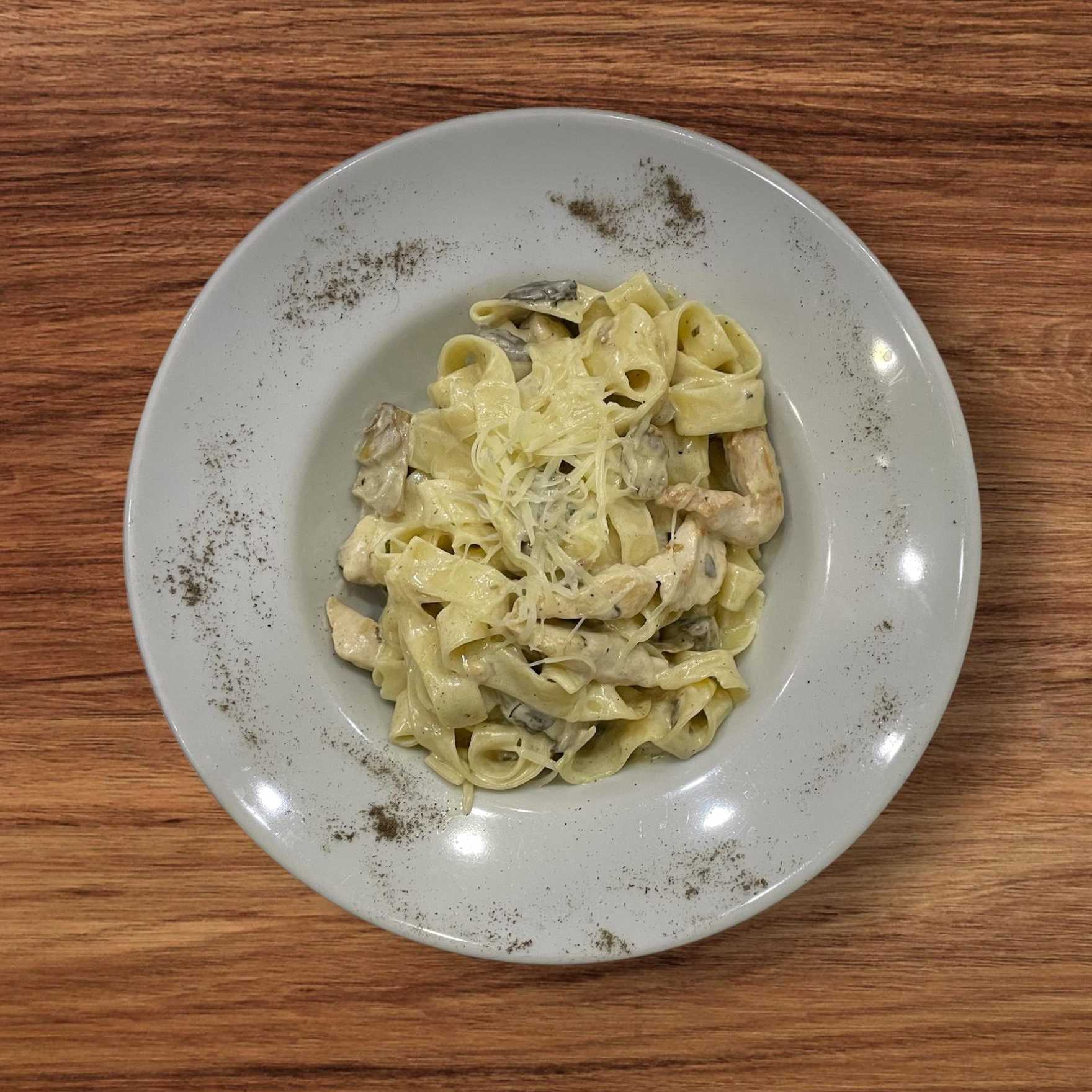 Tereyağında sotelenmiş jülyen tavuk dilimleri, mantar, krema, pesto sos ve kaşar peyniri ile servis edilir.