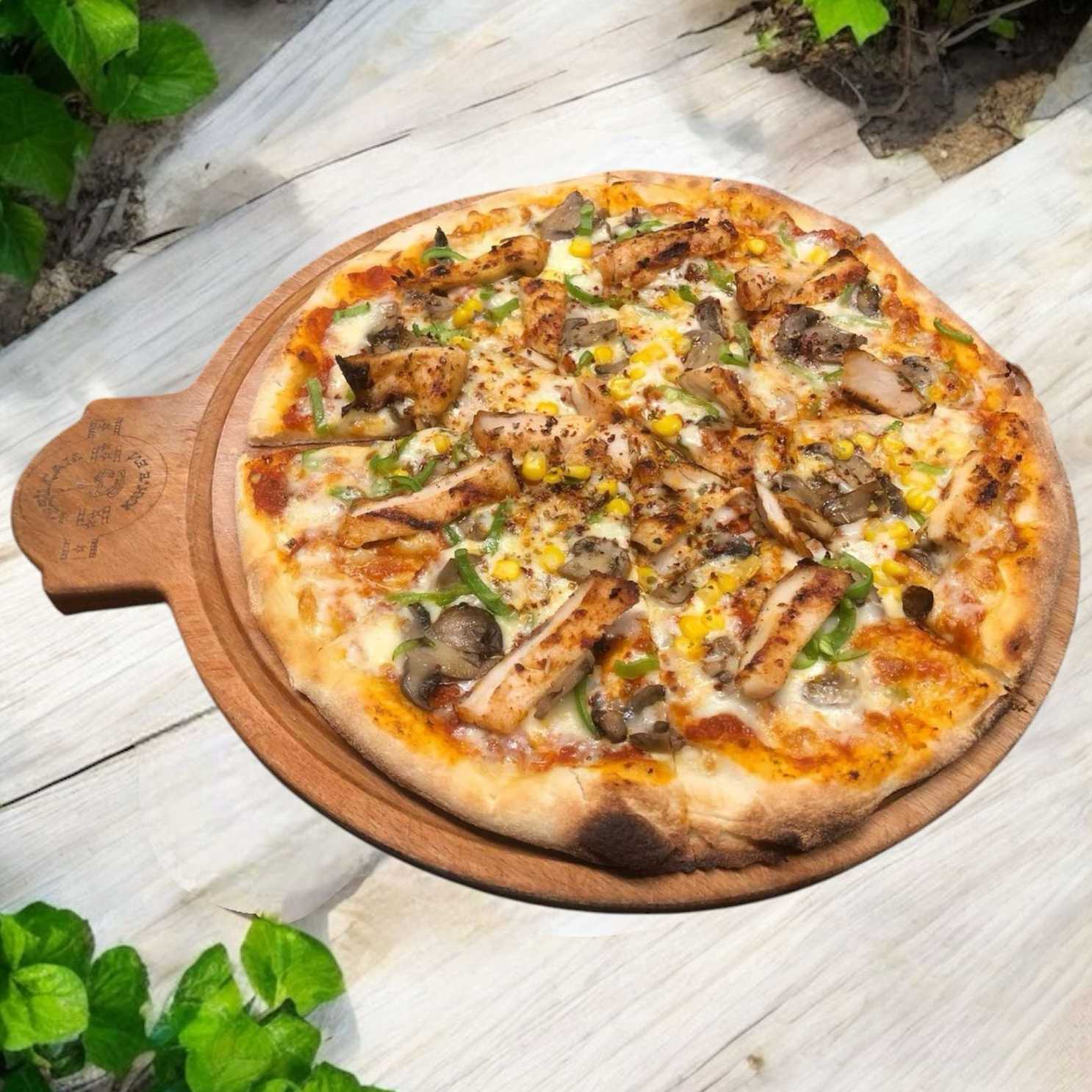 Ev Yapımı Pizza Hamuru, Napolitan Sos, Mozerella Peyniri, Jülyen Tavuk Dilimleri, Renkli Biberler, Mısır, Mantar ve Günün sos ile servis