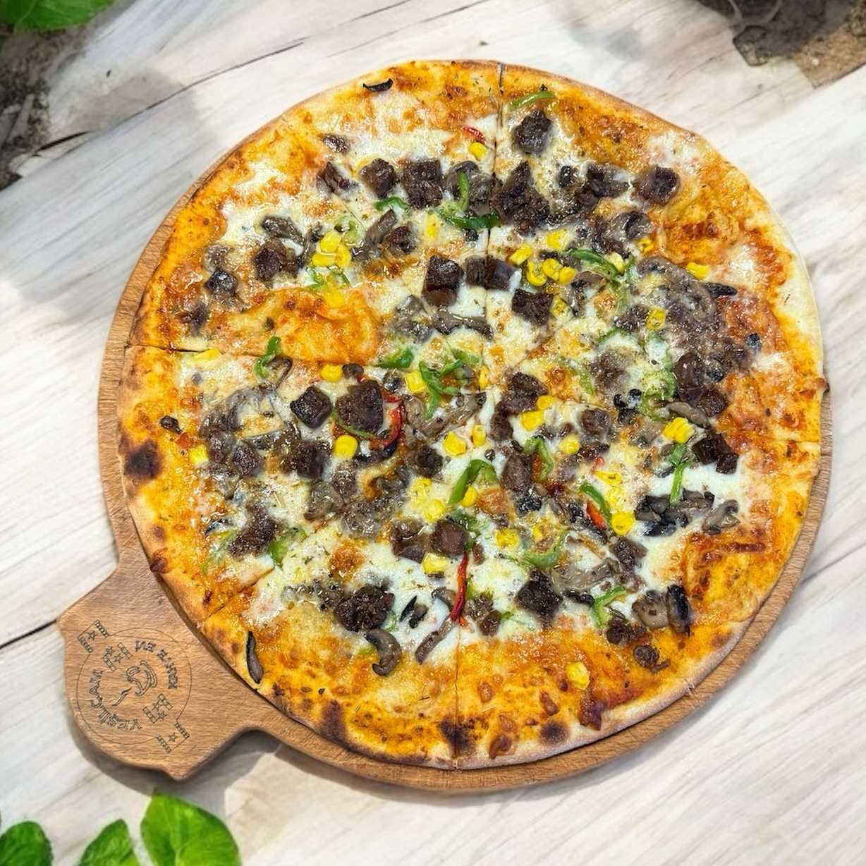 Ev Yapımı Pizza Hamuru, Napolitan Sos, Mozerella Peyniri, Dana Kavurma, Renkli Biberler, Mısır ve Mantar ile Servis Edilir.